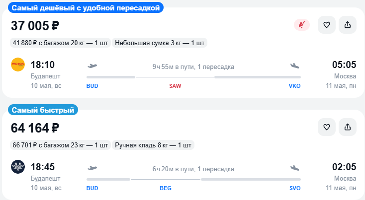 Или любой рейс, с дополнительной ночью в Будапеште и вылетом 11 мая 2026 года