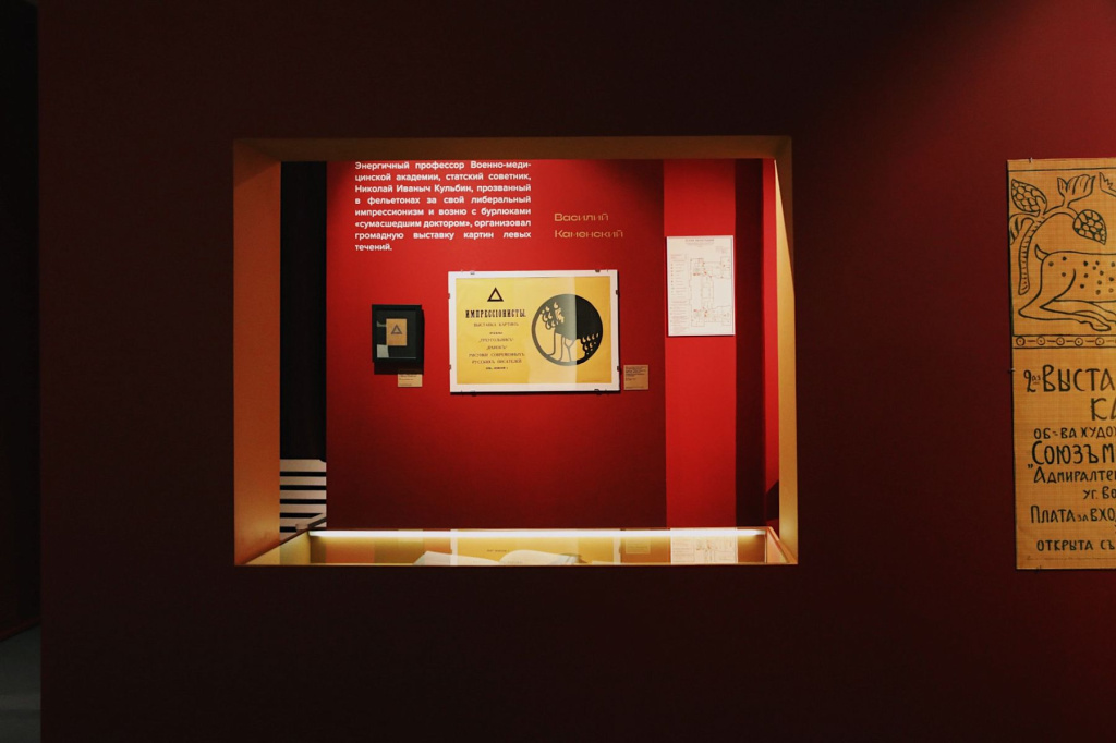 Экспозиция занимает четыре зала, каждый из которых оформлен как самостоятельное произведение: геометрия цвета, мозаика образов, дизайнерские решения вдохновлены эстетикой футуристов. Подборка живописи, афиш и фронтовой графики дополняет книги визуальной средой — от «скандального» манифеста Пощёчина общественному вкусу до серии «Мистические образы войны» Гончаровой.