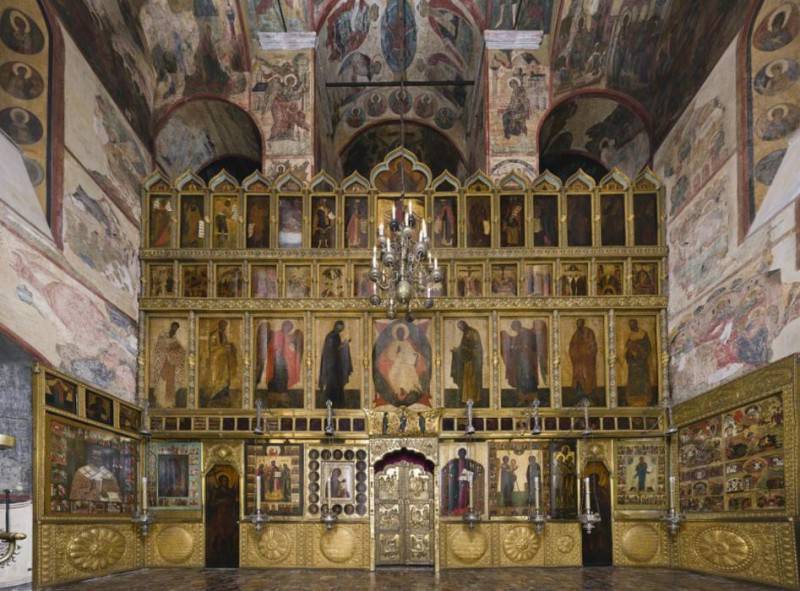 Высокий иконостас – важнейшая составляющая интерьера православного храма. В Древней Руси он приобрел наиболее законченную структуру и символическую программу, стал ярким феноменом национальной художественной культуры. Во времена монгольского ига церковный интерьер существенно меняется, что в итоге приводит к изменению «внешней» архитектуры здания. Наиболее существенной трансформации подвергается алтарная преграда: из невысокой и открытой колоннады она превращается в полностью закрытую, как правило, в четыре яруса стену с порядовым размещением икон. Эта стена закрывает святая святых – алтарь от наоса (основного помещения для молящихся), отделяя, таким образом, священнослужителей от мирян. С этого времени алтарное пространство перестает играть существенную роль в интерьере храма, становясь как бы его внутренним помещением. Меняется и тематика росписей алтарной стены: вместо изображений Божественной Литургии и Причащения появляются фрески на тему церковной историософии.
